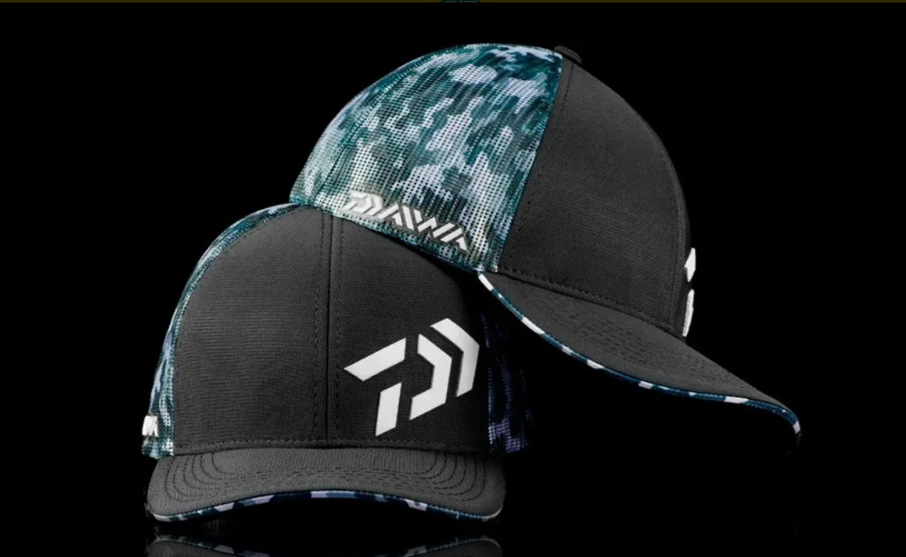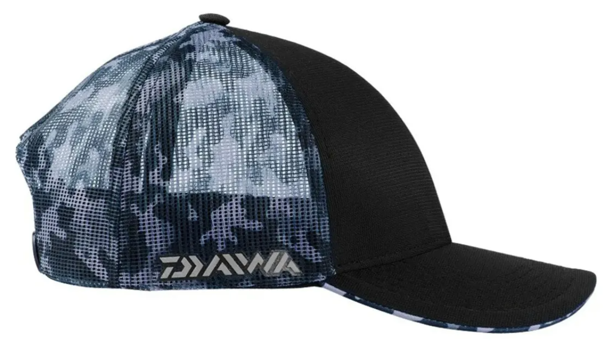 DAIWA PRETO CAMUFLADO éconfeccionadoemPolyester respirável, com tela na parte traseira, muitoconfortável.