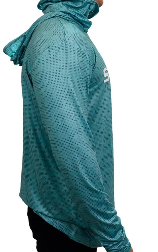 O capuz possui um buff integrado, oferecendo proteção extra para a cabeça, pescoço e rosto, ideal para longos períodos sob o sol.